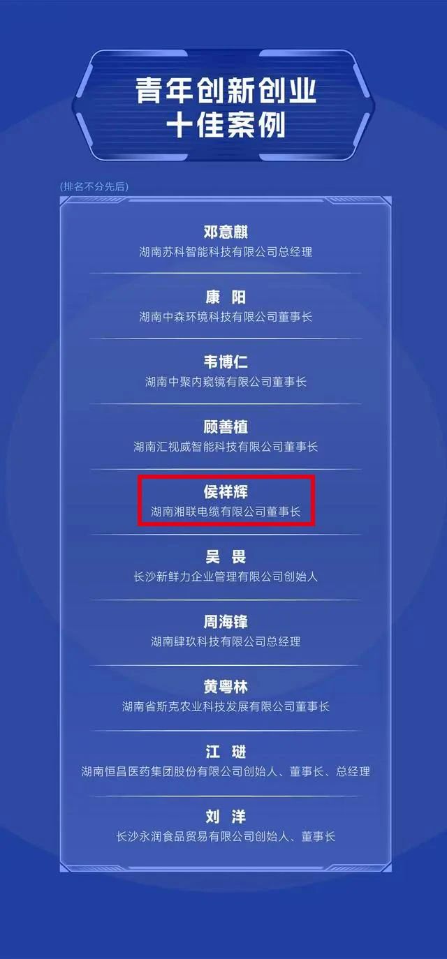 活动现场,发布了发展新质生产力十佳案例、青年创新创业十佳案例、优化营商环境十佳案例3张榜单,湘联电缆董事长侯祥辉光荣上榜青年创新创业十佳案例。
