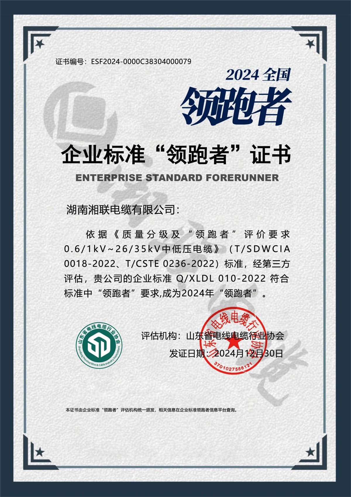 持续领跑 卓越品质|湘联电缆再获企业标准“领跑者”