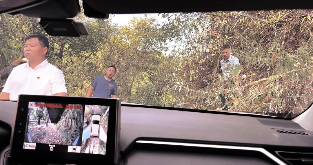 ▲由于探访的路崎岖、窄小,车辆需要多人指引调整前行