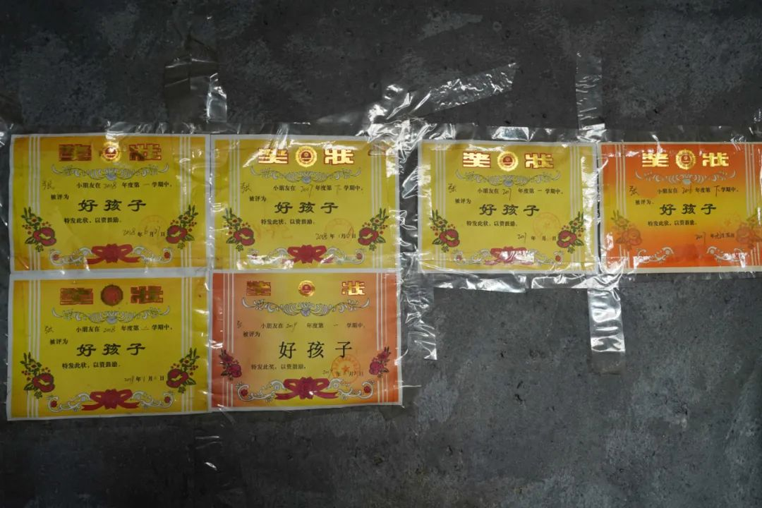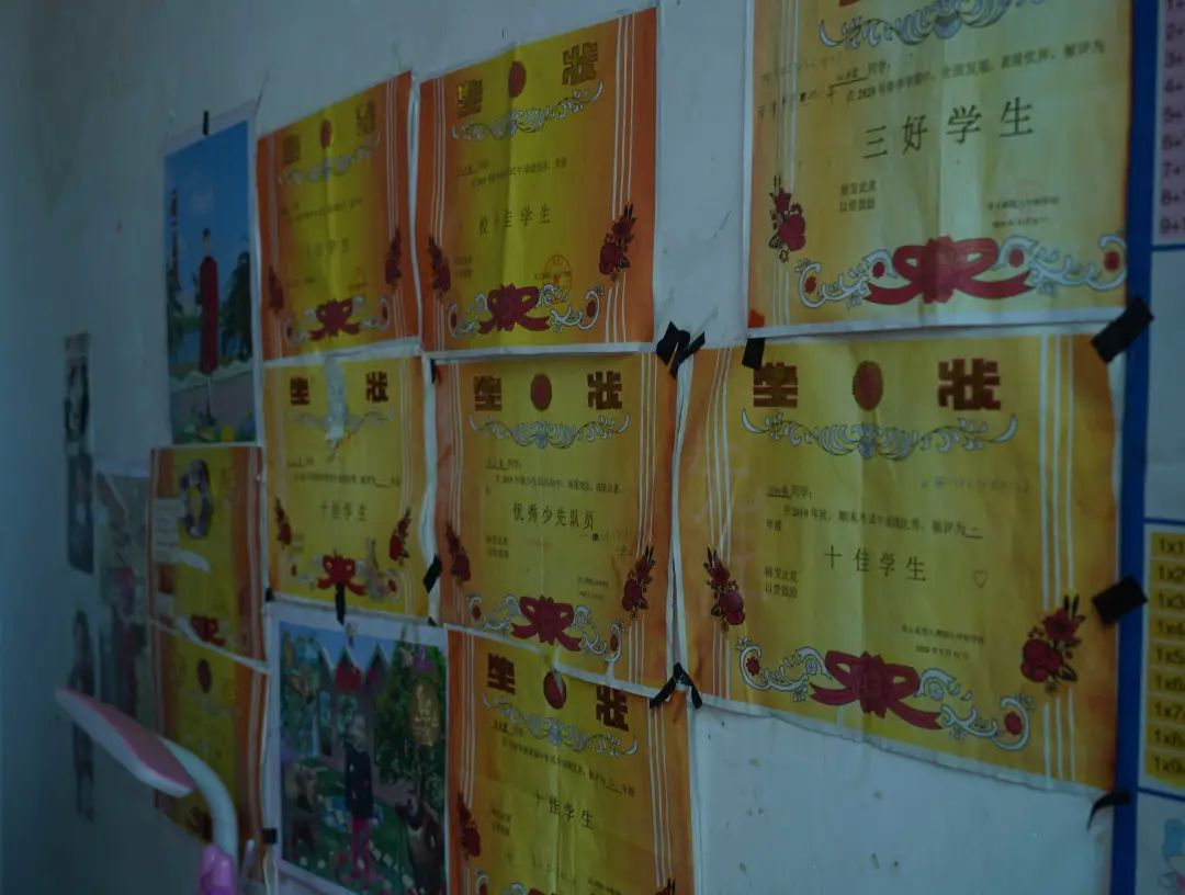 ▲被资助孩子在学校表现优异,奖状贴满墙