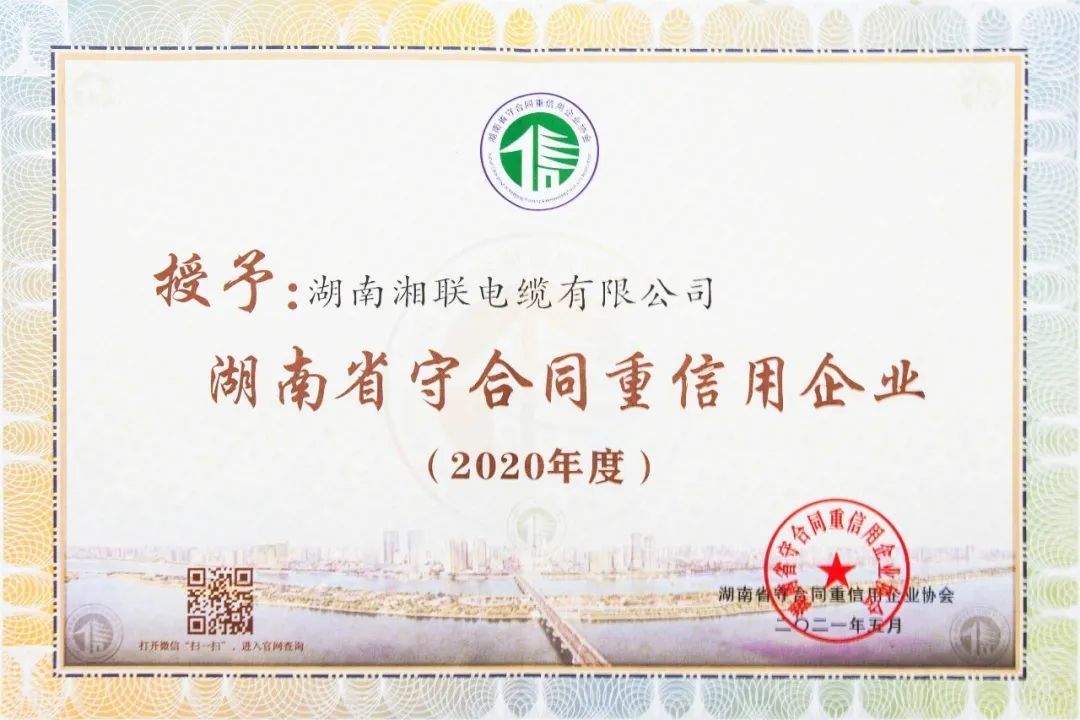 凭借着优质的产品和高效的服务以及诚信的经营,湘联电缆获得了客户和行业的广泛认可和赞誉。2022年,湘联电缆通过国家电网“供应资质能力”审核,荣获“湖南省知名品牌”“2021年度湖南省守合同重信用企业”“湖南省专精特新‘小巨人’企业”“《品牌中国》重点推荐品牌”“绿色工厂”“制造强省项目”等荣誉,收获满满。