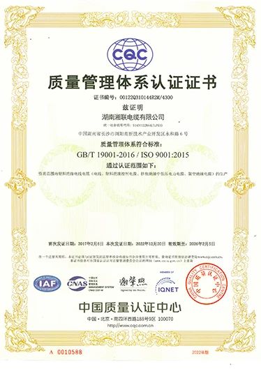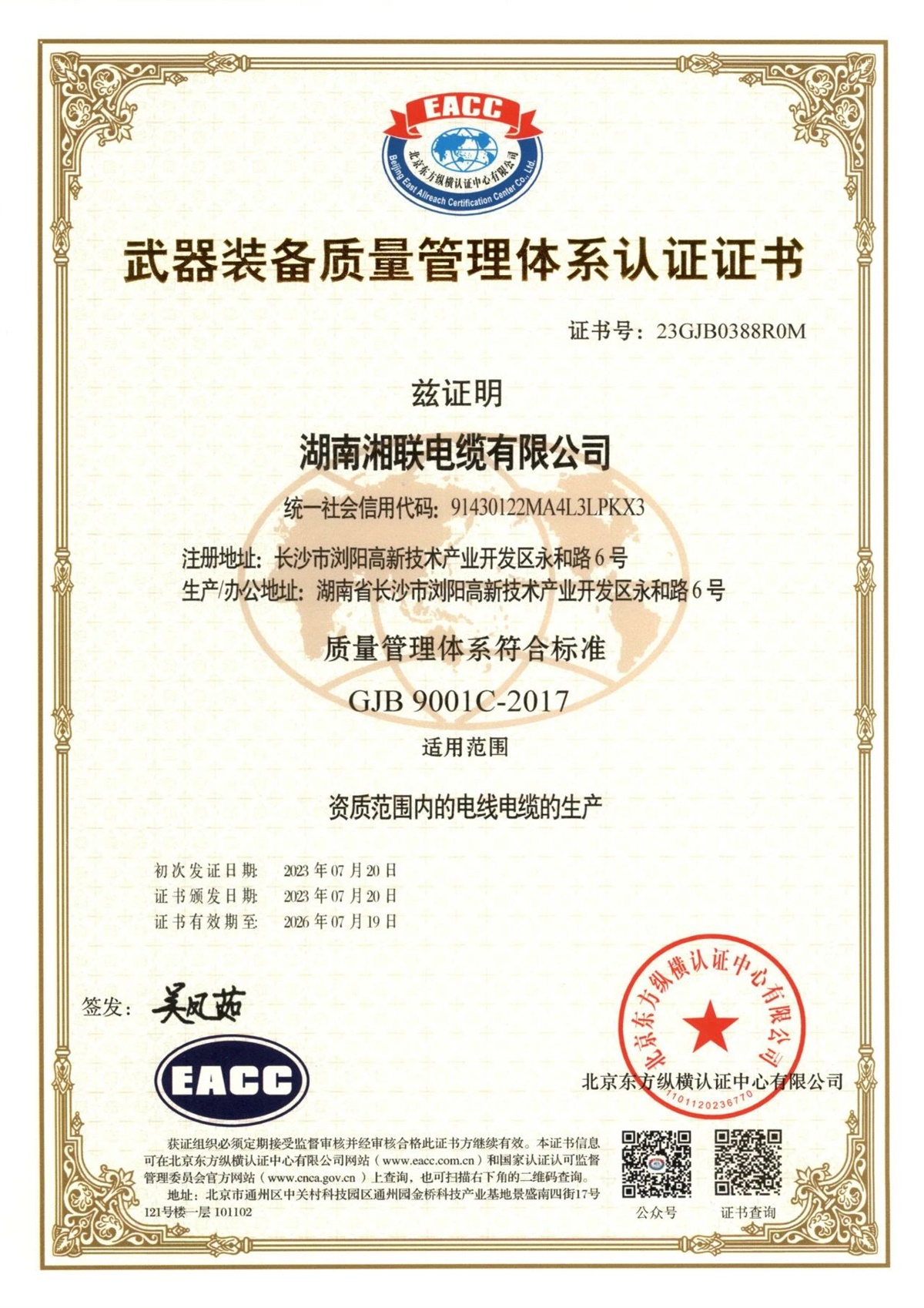 近年来,湘联电缆始终以“质量是发展的基石,是客户信任的唯一理由”的质量方针为导向,逐步建立了高标准质量管理体系。从采购、生产、检测等方面实施全方位质量把控,落实各方面质量责任,实现全过程质量追溯。做到最大限度消除质量隐患,产品质量和客户满意度不断提升。公司先后通过国家强制性产品认证(CCC认证)、全国工业生产许可证、“三位一体”管理体系、武器装备质量管理体系认证,获评专精特新小巨人企业、企业标准“领跑者”等荣誉,得到业界广泛认可和赞誉。