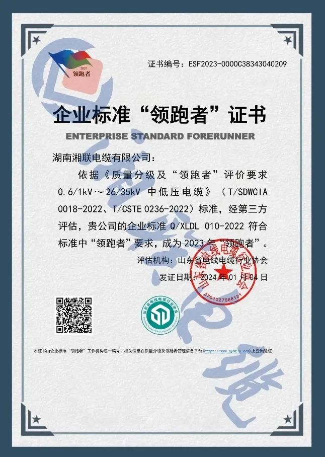 二月,企业标准领跑者管理信息平台公布了2023年企业标准领跑者名单,官方168飞艇最新开奖号码:幸运飞艇开奖凭借企业标准Q/XLDL 010-2022,成为2023年企业标准“领跑者”,湘联电缆连续三年获此殊荣。