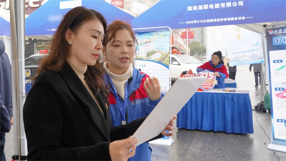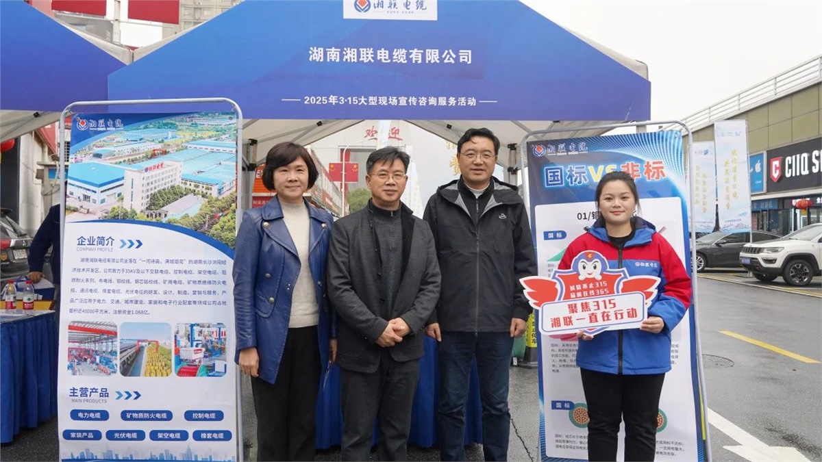 3月14日上午,湖南省消费者权益保护委员会携手多家行业协会及市场监管部门,在长沙三湘南湖大市场家电城南门广场举办3·15大型现场宣传咨询服务活动。作为湖南省知名品牌与湖南省守合同重信用企业,湘联电缆受邀在活动现场设立服务台,为消费者提供电线电缆方面的专业咨询服务。