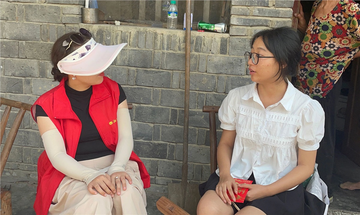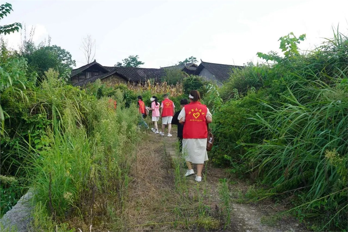 ★不惧高温,志愿者们在当地干部的带领下,步行赶往探访学生家中