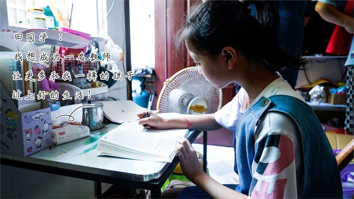 田同学:12岁,母亲患非小细胞肺癌,需要长期治疗,家中还有读幼儿园的弟弟,父亲在家附近打零工,家庭负担重,经济条件拮据。田同学希望自己能够努力学习,考一个好大学,帮助父亲缓解家庭重担。