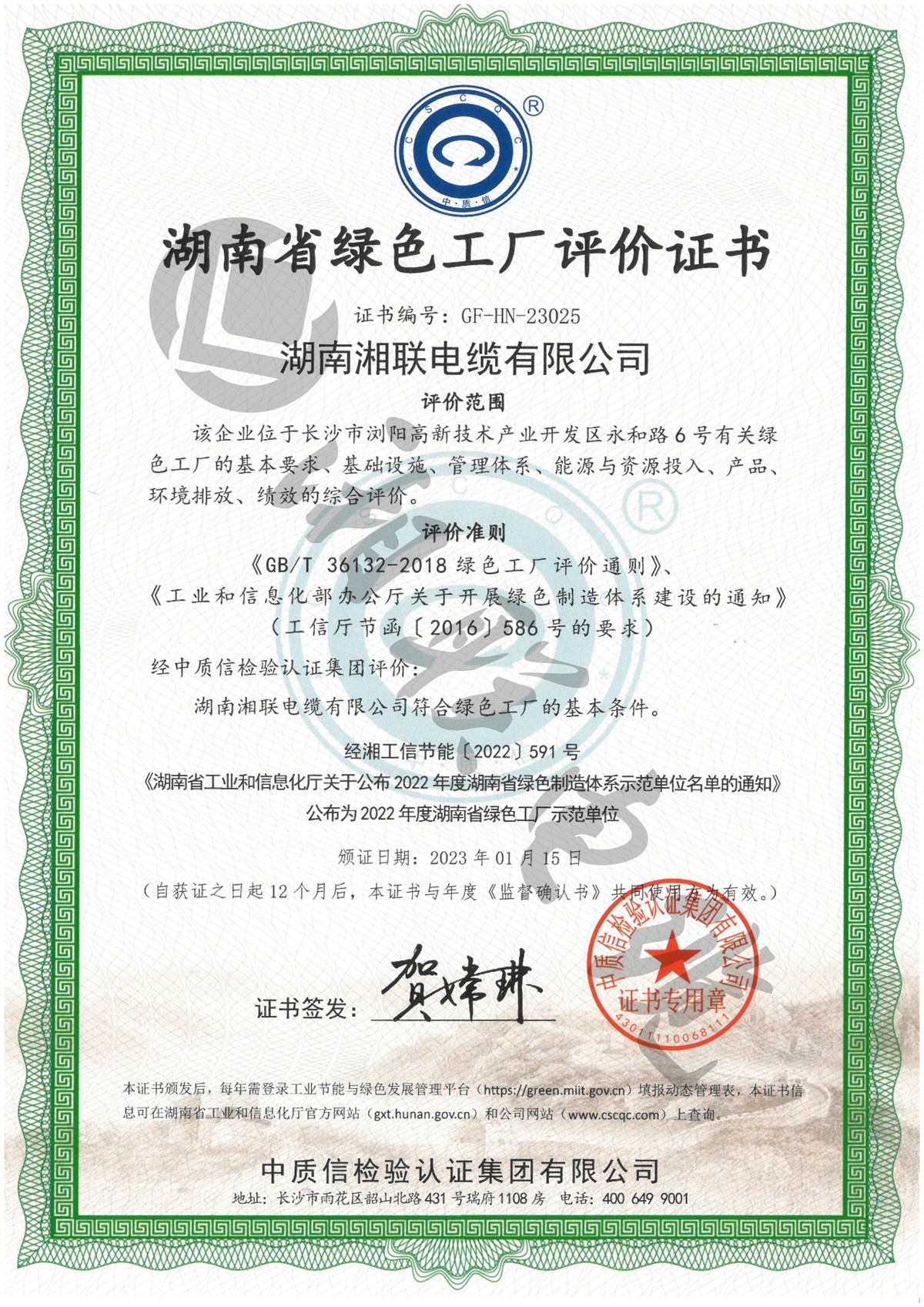 1月,湖南省工信厅公示了2023年湖南省绿色制造体系示范单位名单,湘联电缆凭借绿色完善的体制机制获评湖南省省级“绿色工厂”称号。