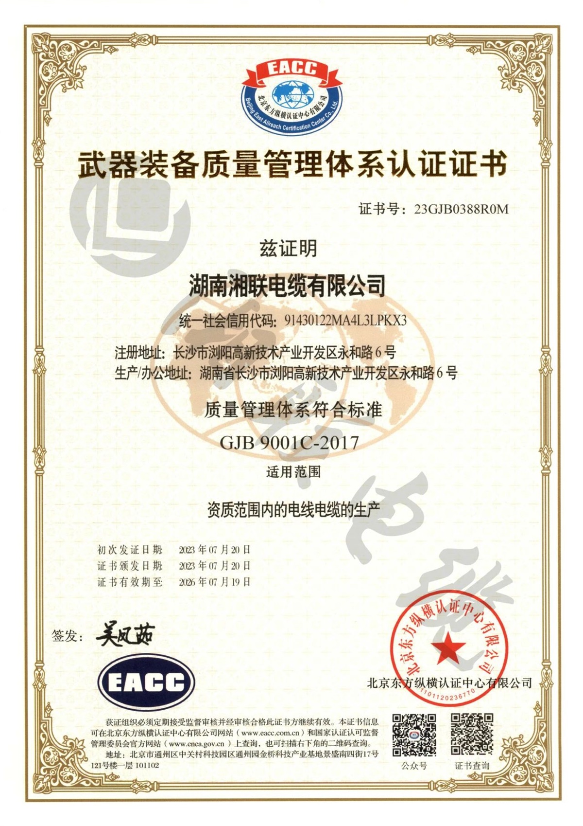 2023年,湘联电缆顺利通过国军标质量管理体系认证,获得《武器装备质量管理体系认证证书》,质量管理体系符合:GJB9001C-2017标准,这表明湘联电缆的质量管理体系符合武器装备质量管理体系的标准及相关要求,具备军品研发、生产和服务的质量管理能力。